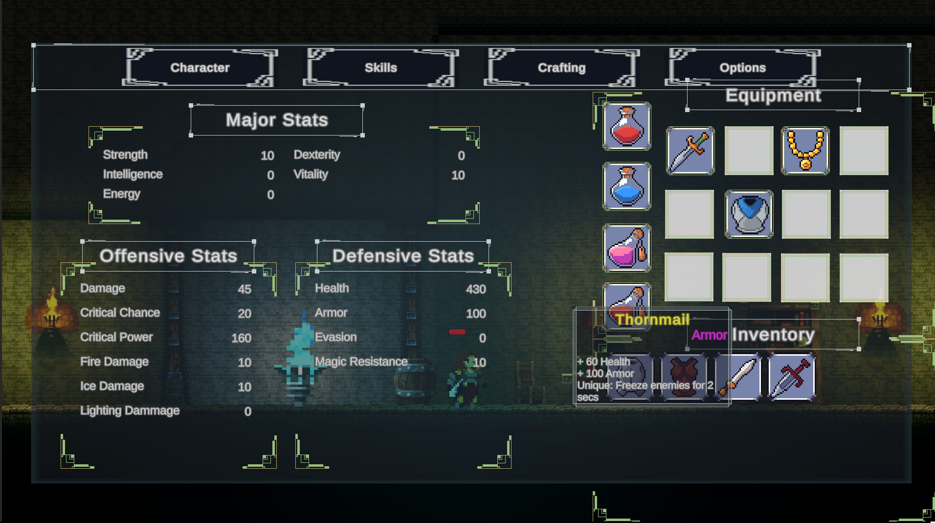 The demo has an inventory and crafting system, a stats system, and a basic options screen.
